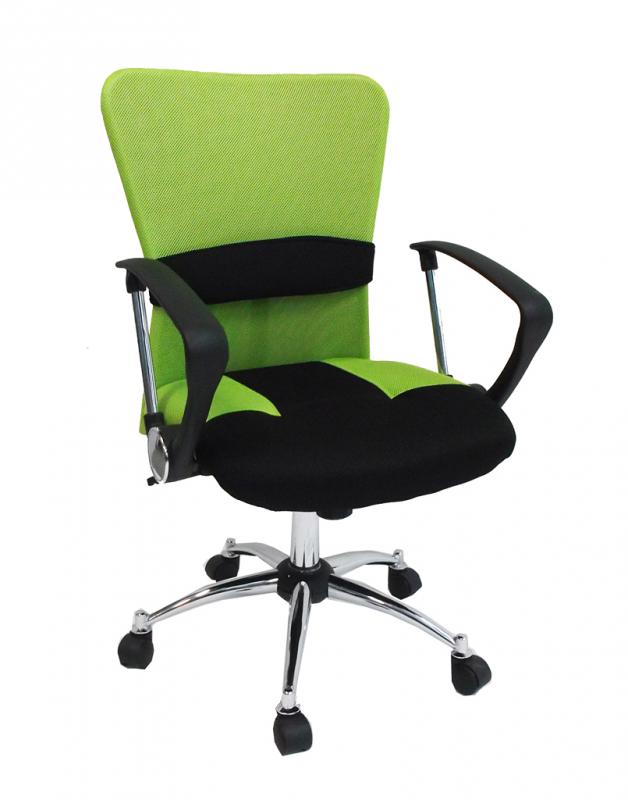 Kancelářské výškově nastavitelné křeslo s područkami, materiál pružná látka. Doplňky z chromu. Opěrka zad s bederní podložkou, chromový kříž s kolečky, plynový píst, houpací mechanismus. Nosnost do 120 kg.
