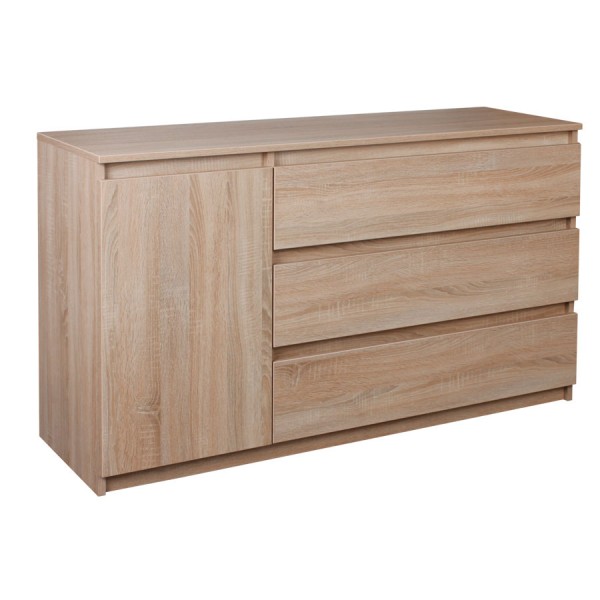 Kombinovaná komoda se 3 zásuvkami a dvířky z lamina tl. 1,8 cm s ABS hranou v dřevodezénu. Uvnitř se nacházejí 2 police. Dvířka jsouo opatřena kvalitními závěsy s dotahem. Zásuvky mají kuličkový celovýsuv. Kvalitní český výrobce.
