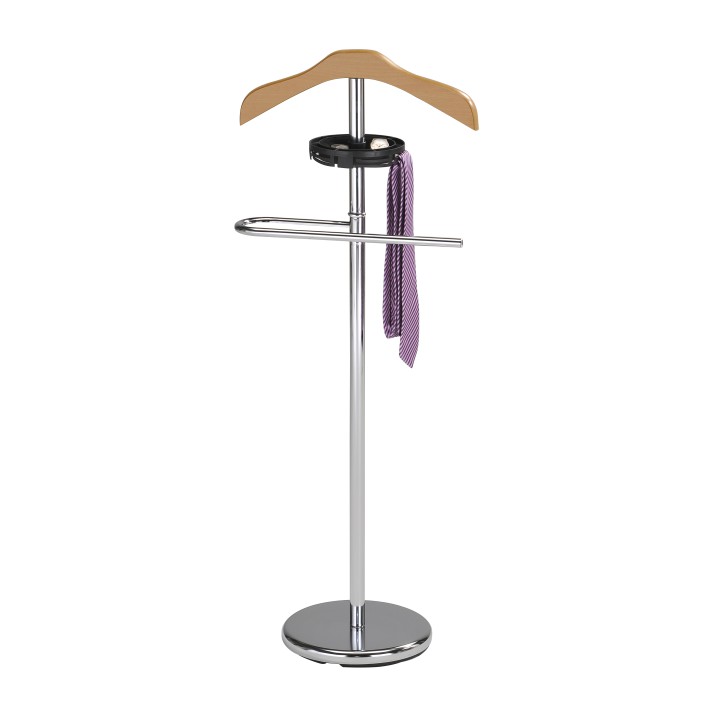 Němý sluha v modermín designu v kombinaci chrom s dřevěnými doplňky v barvě přírodní (buk). Součástí je stojan na kalhoty, ramínko na košile nebo kábaty a kulatá polička na odložení doplňků. Vhodný do ložnice, dětského pokoje nebo předsíně. Dodáváno v demontu.