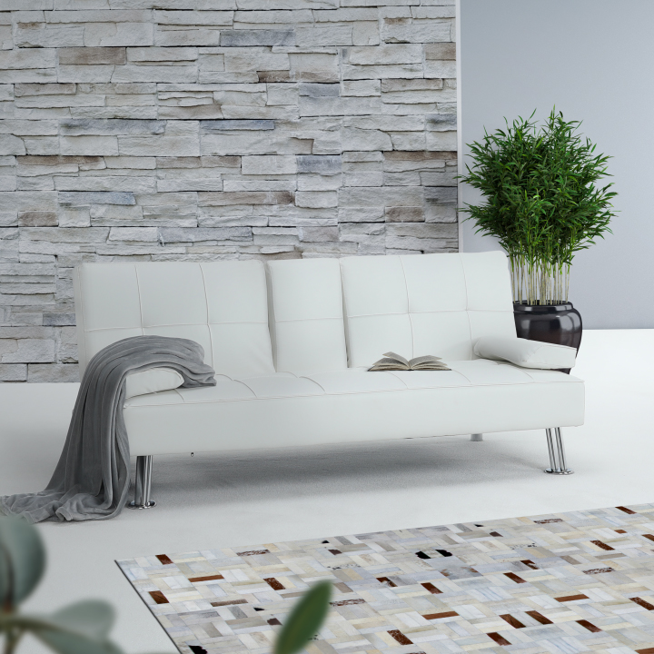 Rozkládací pohovka bez úložného prostoru se sklápěcí střední opěrkou. Kovové nožky. Pohovka je vhodná pro příležitostné spaní.