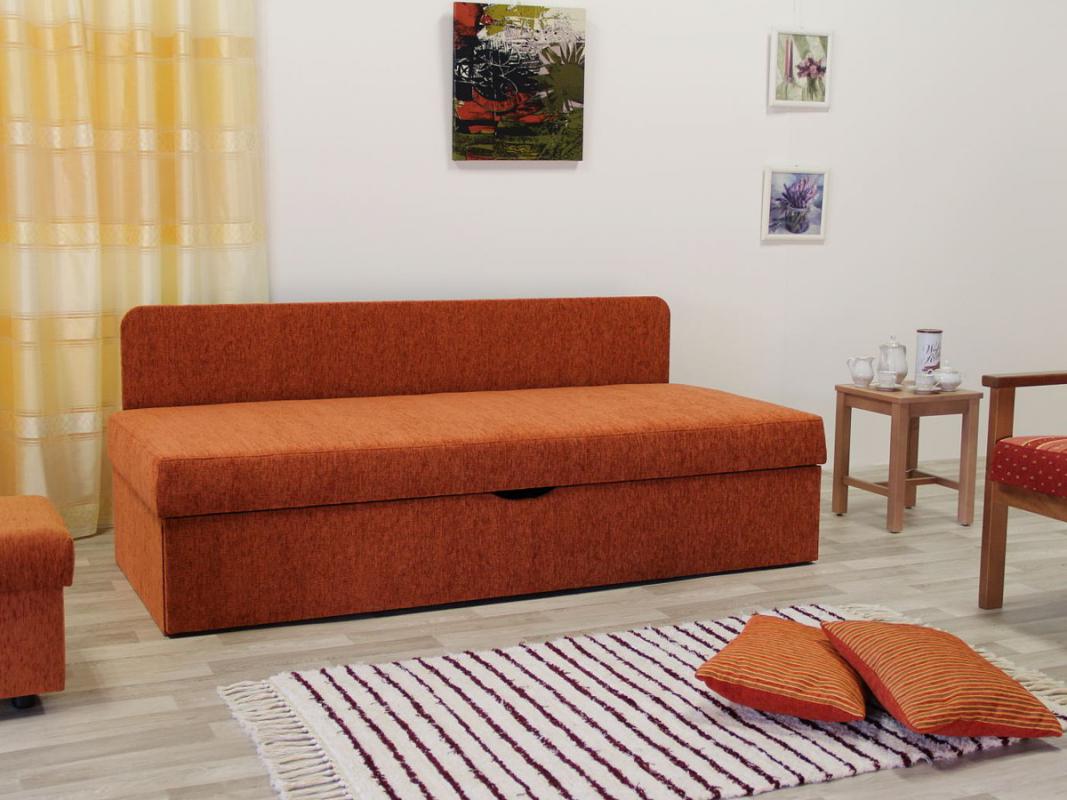 Čalouněná pohovka bez rozkladu na lůžko, polštářů a velkým úložným prostorem. Funkční pohovka je určená pro SENIORY, pro použití v malých bytech seniorských domovů a jejich pohovka má sloužit pro každodenní spaní i denní sezení. Důležitým byla funkce a praktičnost. Kostra je tvořena kombinací masivu a dřevařských velkoplošných materiálů. Sedací a lehací plocha je tvořena pružinovým jádrem (tlačné pružiny) a sendvičem z kvalitních PUR pěn. Polštáře jsou plněny PUR drtí. Pružinový rošt tvoří pevná deska, na níž je umístěné pružinové jádro z tlačných (bonelových) pružin, jako roznášecí a izolační vrstvy slouží tvrzená plsť, na kterou je umístěná sendvičová matrace ze dvou pěn o výšce 4cm. Spodní nosnou vrstvu tvoří zátěžová pěna a horní vrstvu pěna. Kostra je tvořena kombinací masivu a dřevařských velkoplošných materiálů. Jedná se o měkčí a pružnější sezení. Velký výběr potahových látek. Jedná se o kvalitního českého výrobce.