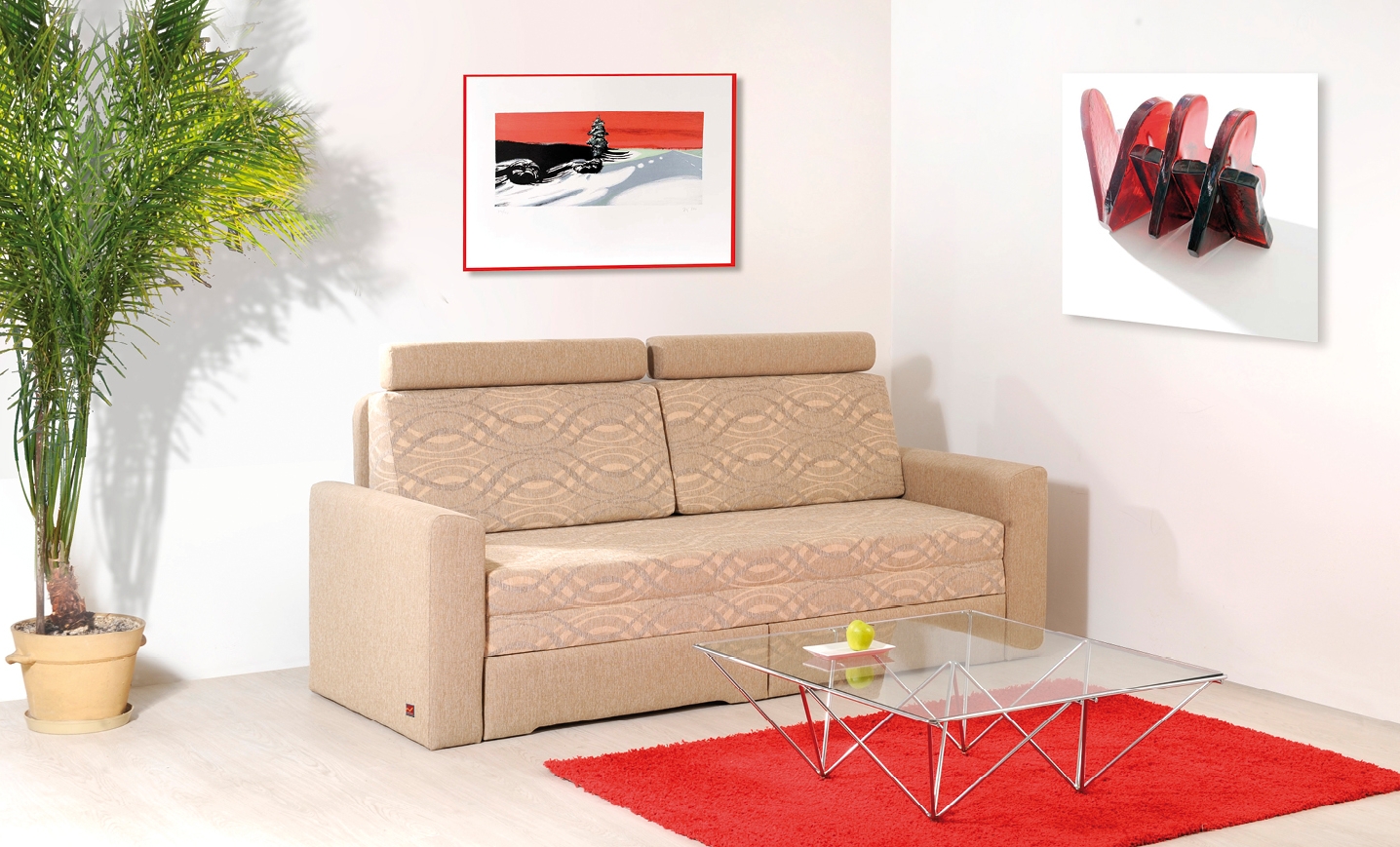 Pohovka s rozkladem na lůžko a děleným výsuvným úložným prostorem. Jednoduchou manipulací lze vytvořit kvalitní dvojlůžko, které se osvědčí především v menších bytech. V pohovce jsou instalovány 2 matrace: překlopná (horní) matrace o síle 12 cm a fixní (spodní) matrace o síle 9 cm. Standartně se pohovka dodává s PUR pěnovou matrací. Pohovka má integrované výsuvné opěrky hlavy. Nosnost do 90 kg. Pohovka je vhodná pro příležitostné spaní. Pohovka nemá očalouněná záda. Kvalitní český výrobce.