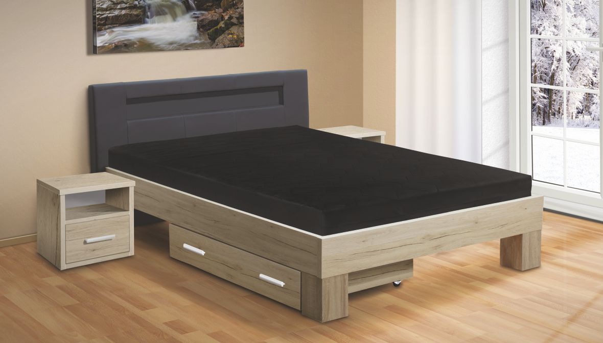 Postel z lamina tl. 3,6 cm, lamelovým roštem, pěnovou matrací a LED osvětlení v čele postele. Uvedená cena je včetně roštu a matrace, bez nočního stolku a úložného prostoru, který si můžete objednat za 1.490 Kč,- a úložný prostor za 1.770 Kč,-.