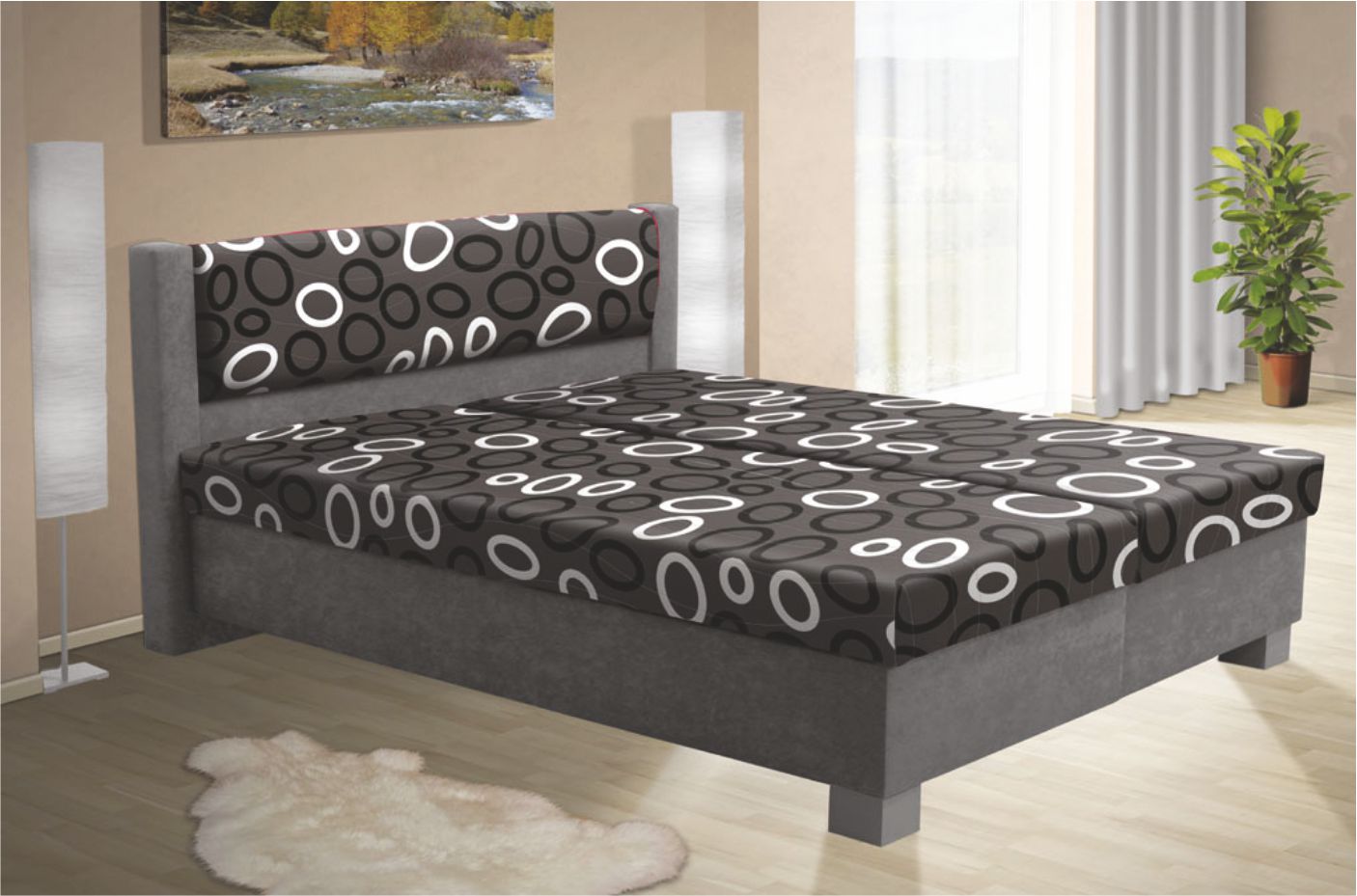 Celočalouněná postel s pružinovými matracemi (složení pružinový rošt+gumožíně, které se neproleží a netlačí pružiny) a úložným prostorem (otvírání od nohou). Dřevěné nohy. Potahová látka prošitá termorounem. Dřevěné nohy. Nosnost do 120 kg.