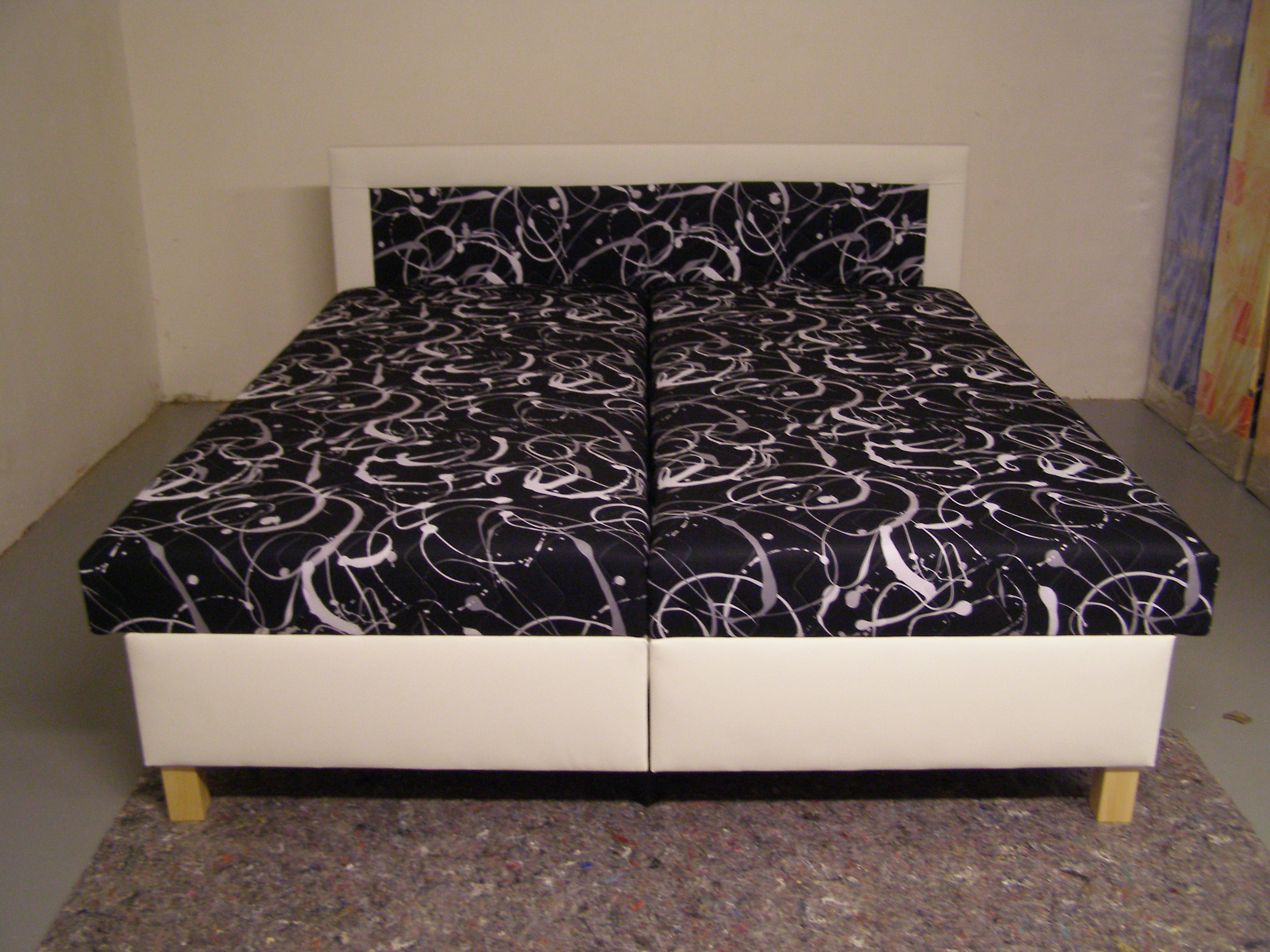 Provedení: eko kůže/pružinová matrace prošitá látkou. Odstíny eko kůže: bílá, béžová, tm.hnědá, sv.šedá, tm.šedá a černá. Na fotografii je postel v bílé eko kůži+prošitá látka č. 218.