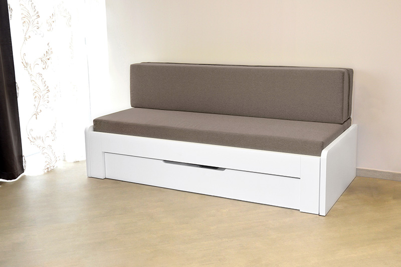 Rozkládací postel představuje řešení do malých interiérů. Ve dne plní funkci sedačky a v noci poslouží jako plnohodnotné dvojlůžko. Postel je vyrobena z kvalitního lamina tl. 3,8 cm, které zabezpečuje stabilní a pevnou konstrukci. Zaoblená boční čela pro vyšší bezpečnost. Uvedená cena je včetně lamelového roštu, bez matrace, područek a bez úložného prostoru. Postel si můžete objednat v rozměru 80x200 cm nebo 90x200 cm za stejnou cenu.