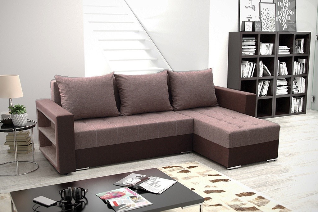 Rohová moderní a elegantní sedací souprava s praktickou poličkou, rozkladem na lůžko a úložným prostorem. Polička je čalouněná látkou v barvě sedáku.Pohodlné sezení zaručují bonellové pružiny s PUR pěnou. Nožky jsou z pochromovaného kovu. Levé nebo pravé provedení. Na úvodní fotografii je pravá varianta. Sedací souprava je určena pro příležitostné spaní.