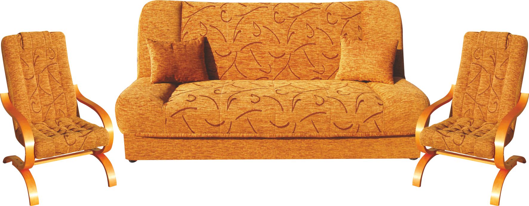 Sedací souprava s rozkladem na lůžko a úložným prostorem. Výplň tvoří pružiny. Křesla jsou pohupová. Uvedená cena je za komplet (pohovka + 2 křesla). Sedací souprava je vhodná pro příležitostné spaní. Polštářky nejsou součástí.