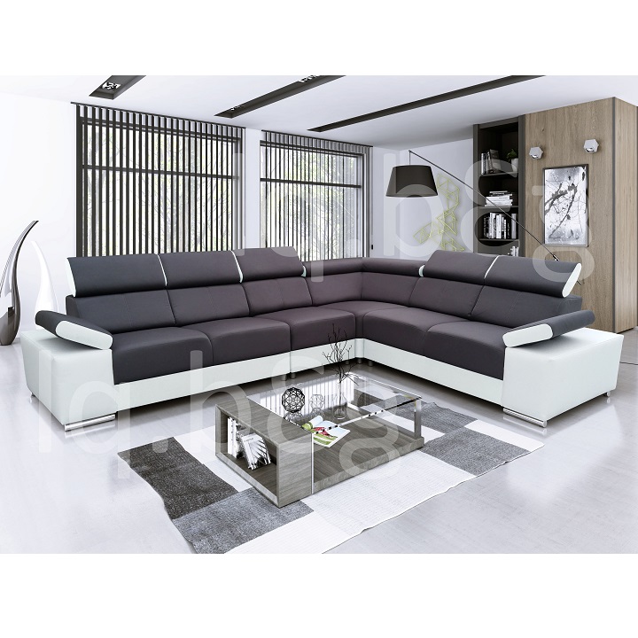 Moderní, celočalouněná rohová sedací souprava bez rozkladu na lůžko a úložného prostoru. Polohovatelné opěrky hlavy a područky. Levé nebo pravé provedení. Na obrázku je levá varianta. Sedací souprava je vhodná pro příležitostné spaní.