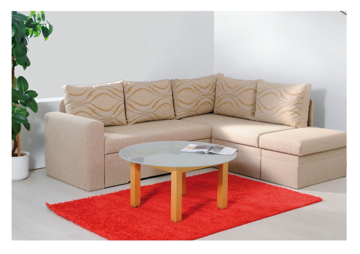 Rohová rozkládací sedací souprava s kulatým rohem umožňující vysoký komfort sezení i spaní, je vybavena objemným úložným prostorem a odnímatelnými opěrnými polštáři. Výplň je tovřena vrstvenou PUR pěnou, matrace po rozložení je očalouněná. Tento typ sedačky je velmi žádanou variantou, umožňující díky své konstrukci každodenní rozkládání. Levé nebo pravé provedení. Na úvodní fotografii je pravá varianta. Sedací souprava nemá očalouněná záda (delší i kratší strana). Nosnost do 90 kg. Kvalitní český výrobce.