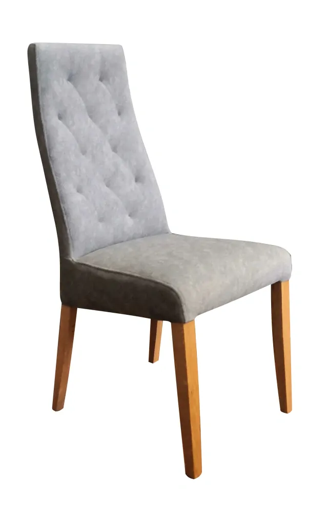 Vyšší jídelní židle, sedák i opěrák čalouněný, nohy dub.