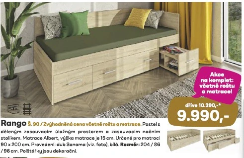 Jednolůžková postel RANGO s úložným prostorem, výsuvným nočním stolkem a roštem. Bočnice lze namontovat na pravou i levou stranu. Dodáváno bez matrace.